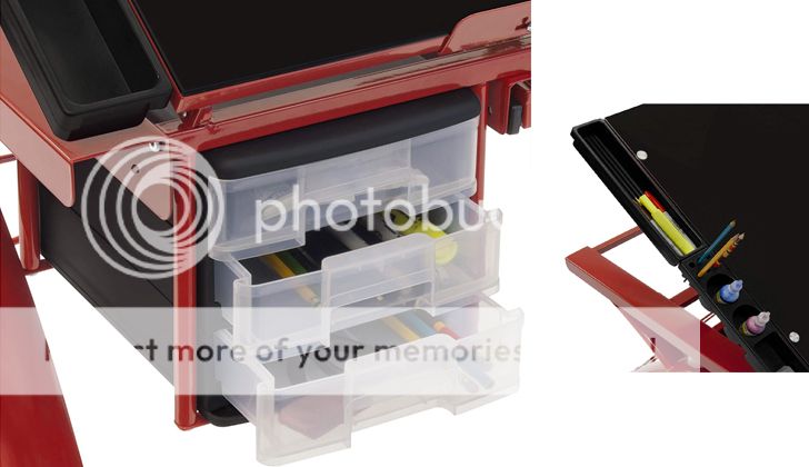 Además cuenta con tres gavetas de plástico para almacenar, las cuales puedes montar en la parte izquierda o derecha, para que elijas donde es mas cómodo para ti. Tiene 2 bandejas laterales que te ayudaran a guardar todos tus materiales de dibujo, desde lápices, colores, hasta acuarelas, pinceles y estilógrafos.