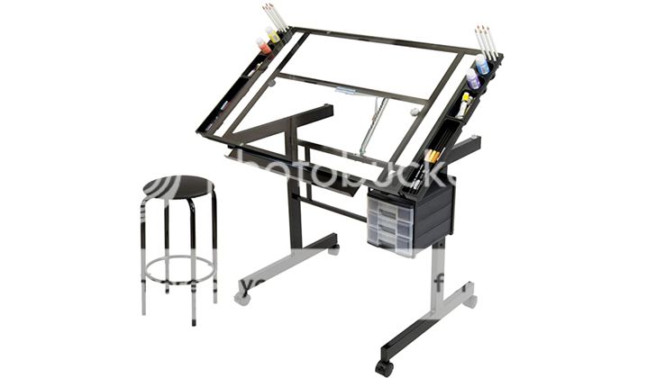Puedes encontrarlo en color plateado/vidrio azul y blanco/negro para los que prefieran una mesa de dibujo barata y tradicional.